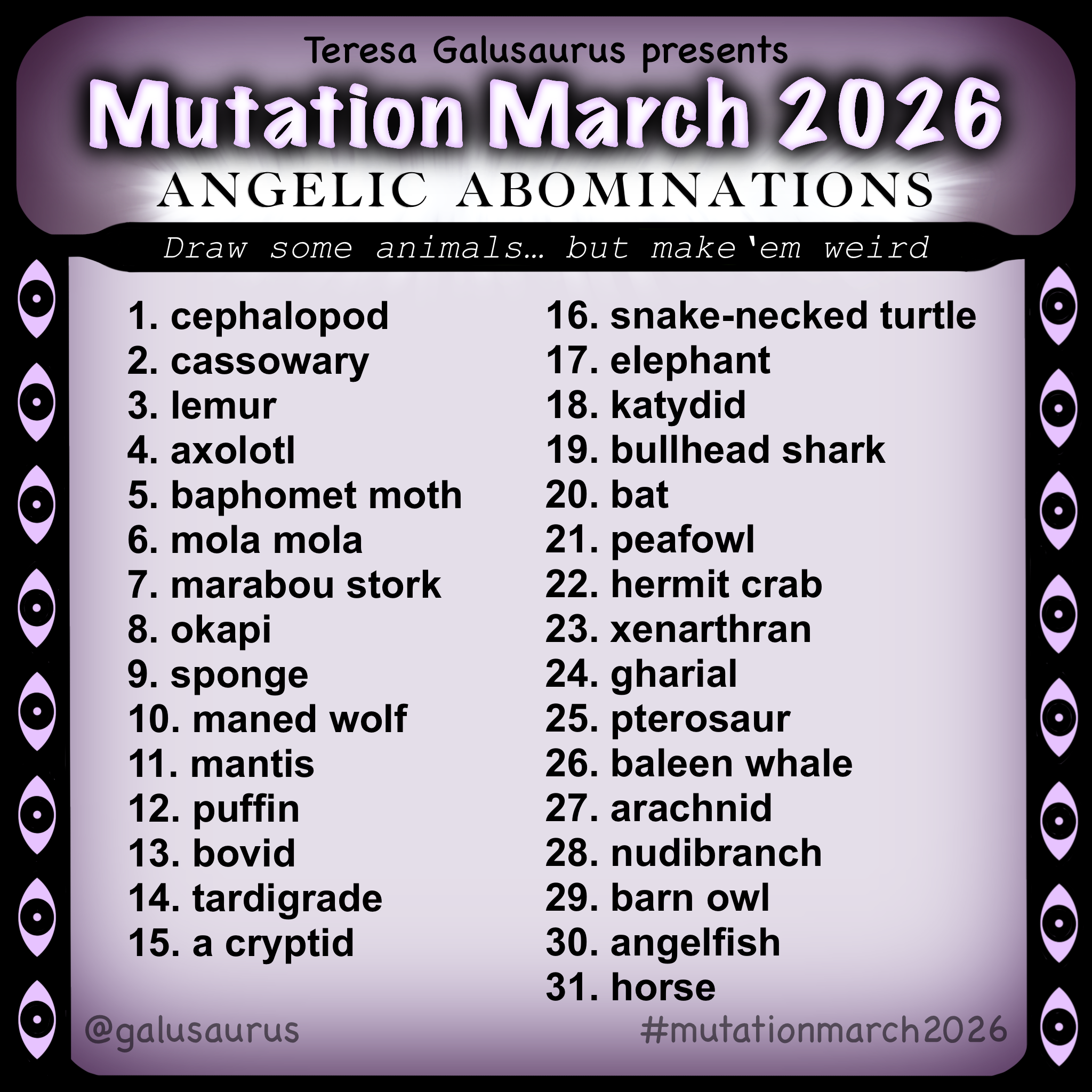 OVERVIEW 2025 Mutation March 2026 View fullsize Let’s go, Year Eight! It’s time for some Angelic Abominations. PatreonFor exclusive behind-the-scenes art and sketches Instagram, Bluesky, & TumblrFollow along and join in with #MutationMarch2026 EtsyMini art prints available here OVERVIEW 2025